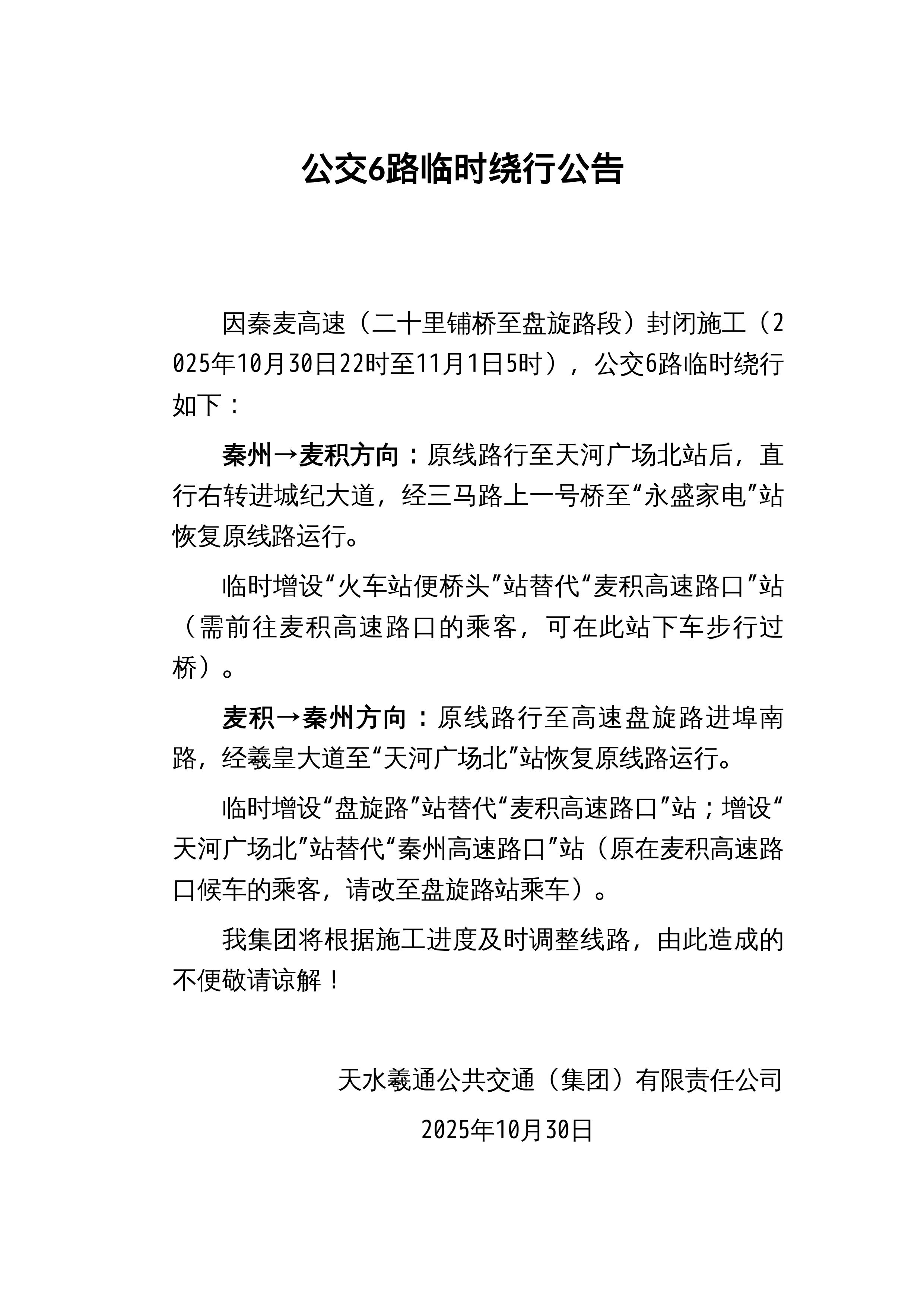 公交6路臨時繞行公告